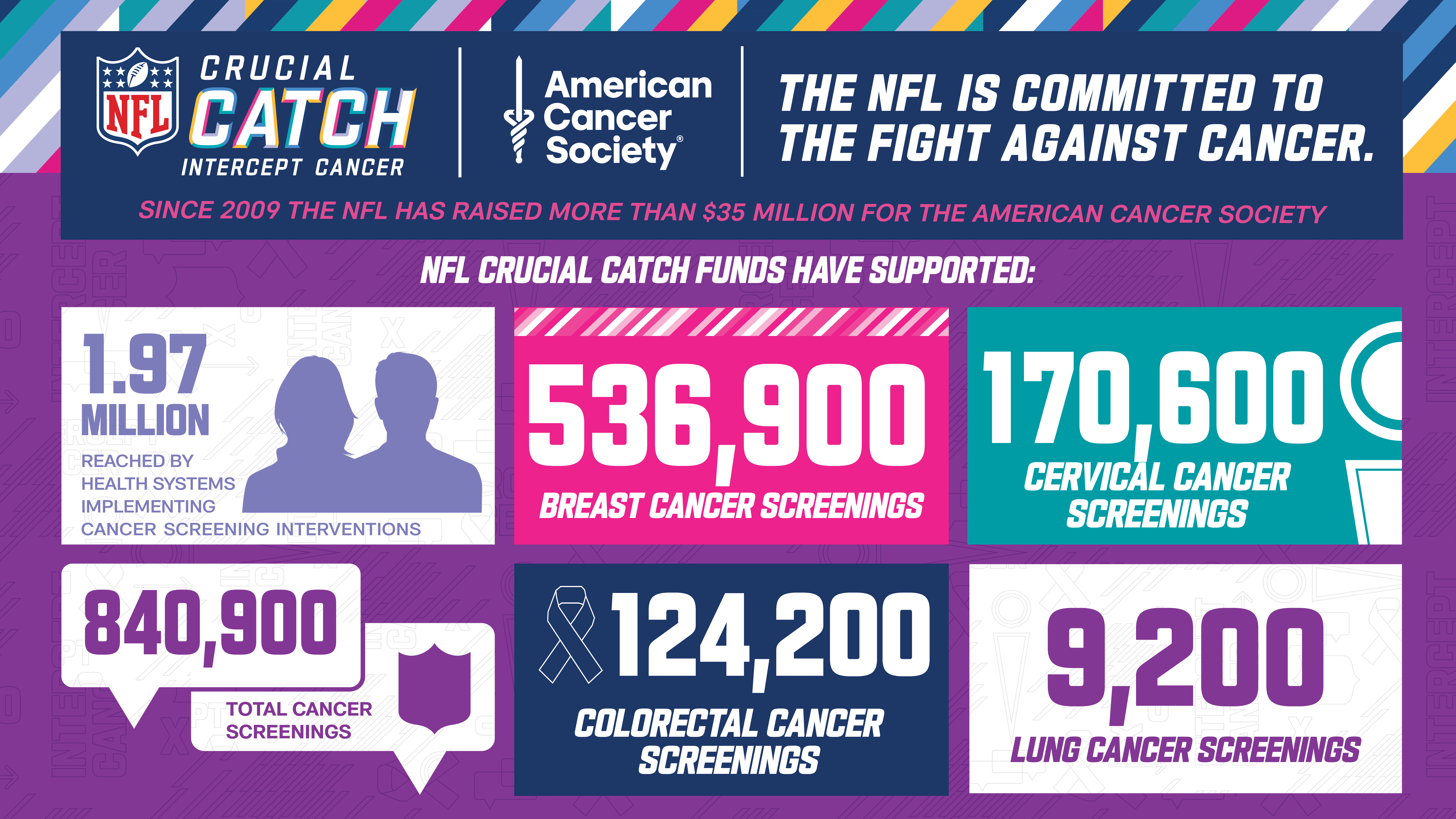 The NFL’s Crucial Catch mission is to fight cancer through early detection and risk reduction. The league, its clubs, players, the NFL Players Association and the American Cancer Society are committed to providing individuals with the tools they need to help them better understand early detection and ways to reduce their cancer risk. Each year, every NFL team raises awareness during their Crucial Catch game, which features on-field and in-stadium Crucial Catch elements. Crucial Catch games also present a special opportunity to honor cancer survivors and those currently battling cancer.